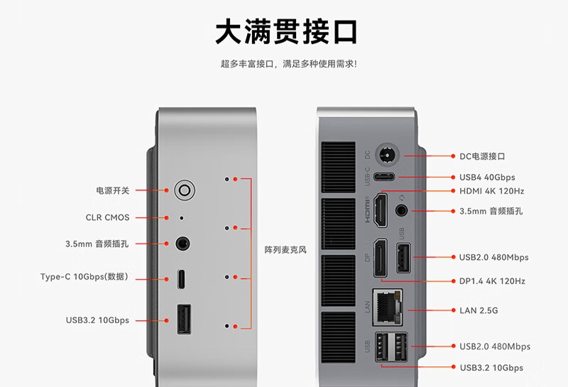 这款迷你主机有冰霜银、琥珀橙、翡冷绿、深空灰四种颜色可选,内置扬声器、双喇叭、MIC 拾音降噪 B1 AI 芯片。