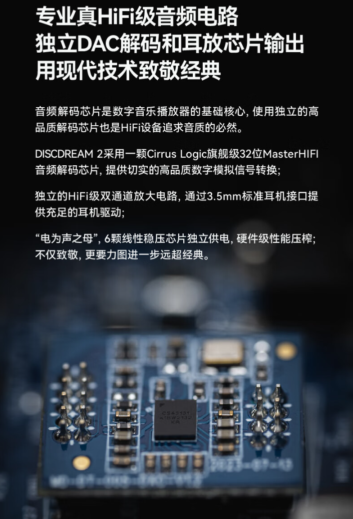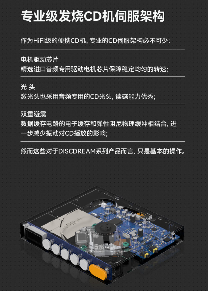 该播放机搭载电机驱动芯片,配备音频专用 CD 光头,辅以双重避震(数据缓存电路的电子缓存和弹性阻尼物理缓冲相结合)。播放机内置 Cirrus Logic 旗舰级 32 位 MasterHIFI 音频解码芯片 、6 颗线性稳压芯片独立供电。