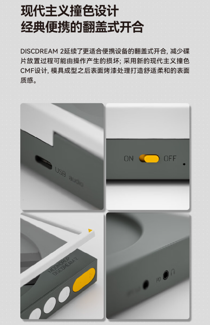 据介绍,水月雨・梦想碟机・二式便携式 CD 播放机采用“现代主义撞色”CMF 设计,使用翻盖式开合,官方宣称“可减少碟片放置过程中可能产生的损坏”。