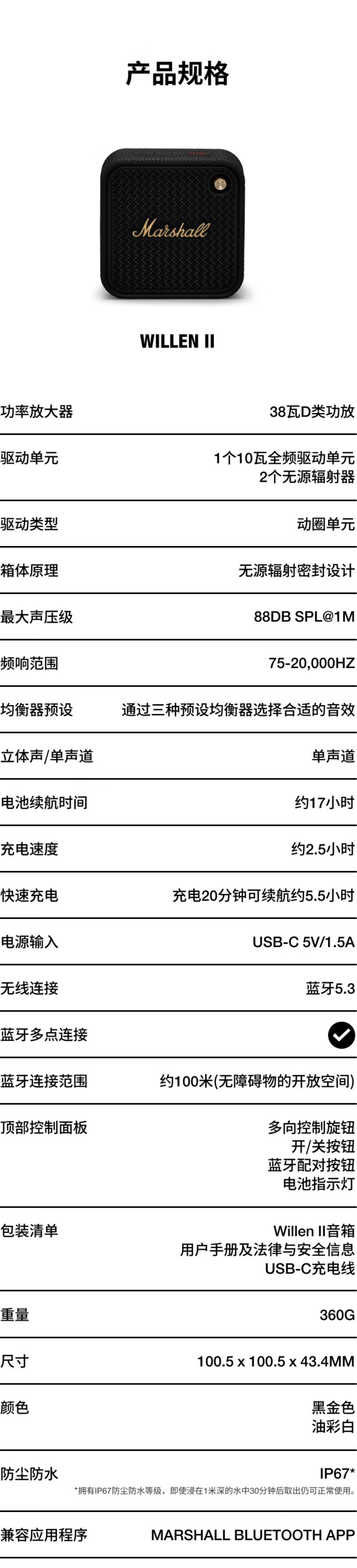 IT之家 9 月 23 日消息,马歇尔(Marshall)旗下新品 WILLEN II 现已在电商平台上架,其采用正方形设计,具备约 17 小时续航和 IP67 等级防尘防水,售价为 999 元。