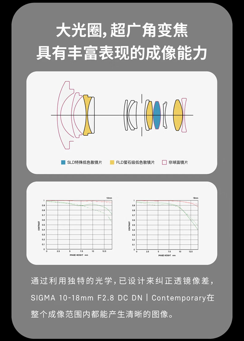 镜头构造:10 组 13 片 (3 片 FLD、1 片 SLD、4 片非球面镜片)