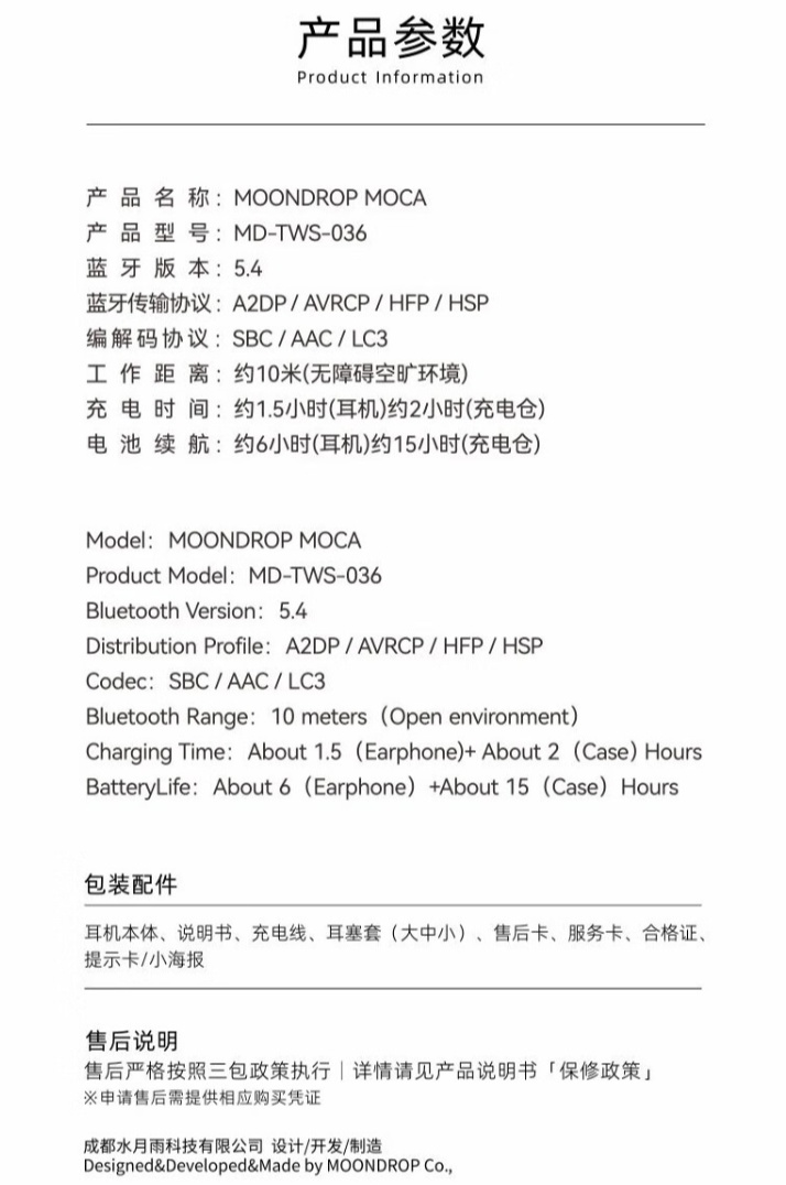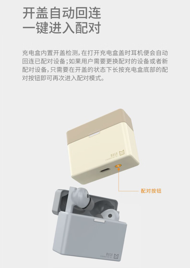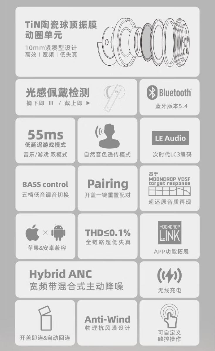 该耳机还支持开盖自动回连、一键进入匹配;耳机充电仓支持无线充电。用户还可通过 MOONDROP App 进行降噪 / 透传切换、自定义设置和功能拓展。