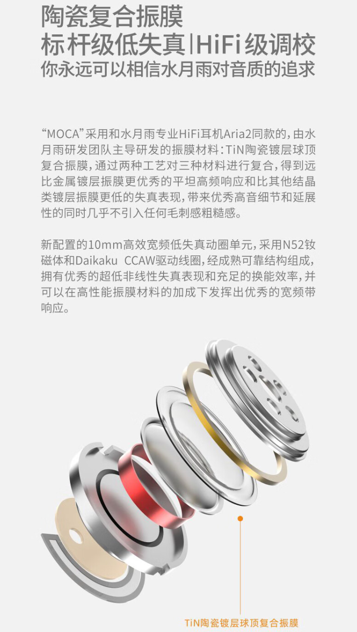 该耳机配备 TiN 陶瓷镀层球顶复合振膜 + 10mm 宽频低失真动圈单元,辅以 N52 钕磁体和 Daikaku CCAW 驱动线圈,拥有五档低音调音切换。水月雨猫咖 MOCA 还支持自然声色透传模式。