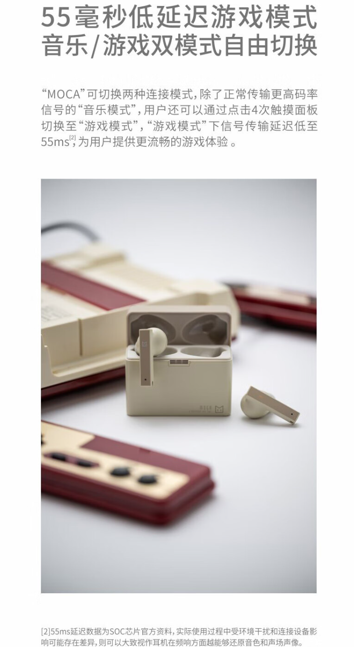 MOCA 可切换两种连接模式,除正常传输更高码率信号的“音乐模式”,用户还可以通过点击 4 次触摸面板切换至“游戏模式”,官方宣称该模式下信号传输延迟低于 55ms。