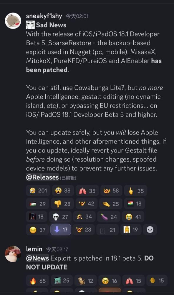 也就是说,如果没有挖出新的漏洞,用户将无法再对 iOS / iPadOS 18.1 Beta 5 及更高版本进行类似的破解和修改,自然也包括即将在今年秋季发布的 iOS & iPadOS 18.1 最终版本。