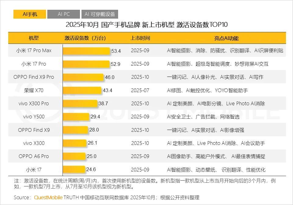 具体来看,小米17 Pro Max、小米17 Pro和OPPO Find X9 Pro登顶10月国产新旗舰机激活设备数Top3。