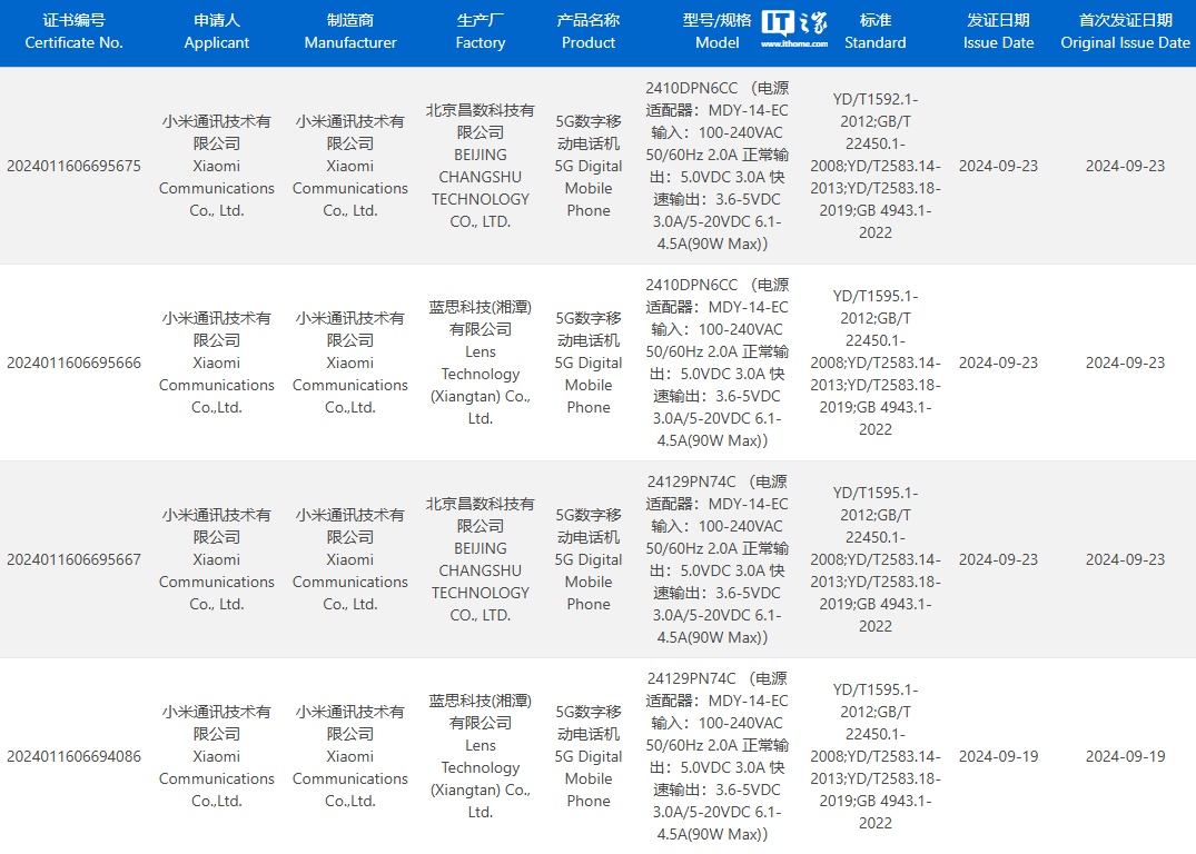 这两款机型均由北京昌数科技有限公司、蓝思科技(湘潭)有限公司代工,均采用 MDY-14-EC 充电器(小米 13 Ultra 同款)。