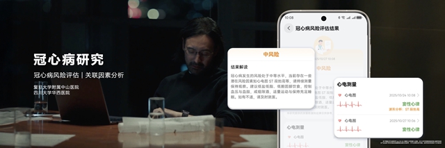 该功能依托手表高精度传感器,可持续监测用户心电与脉搏波数据,结合临床验证算法,用户通过华为创新研究App加入冠心病研究后,连续佩戴约3天时间即可生成个人冠心病风险报告,辅助冠心病风险筛查,为高风险人群提供了全新的院外健康管理路径。