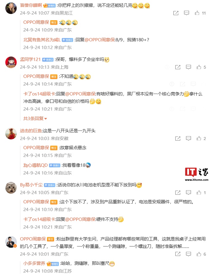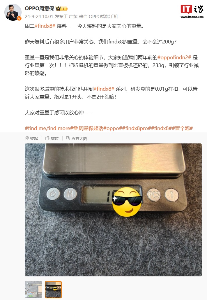 IT之家 9 月 24 日消息,OPPO Find 产品负责人周意保今日再次发文“爆料” Find X8 手机参数信息。他表示,很多减重的技术用到了 OPPO Find X8 手机,其重量“绝对是 1 开头,不是 2 开头”。