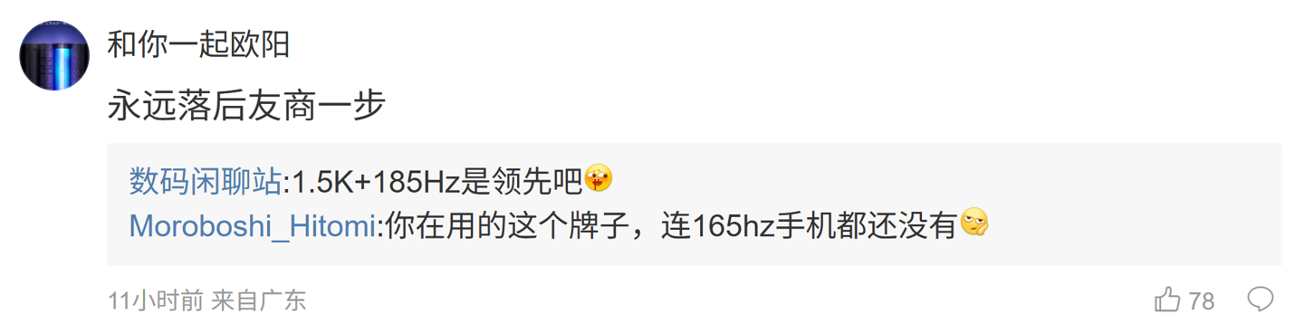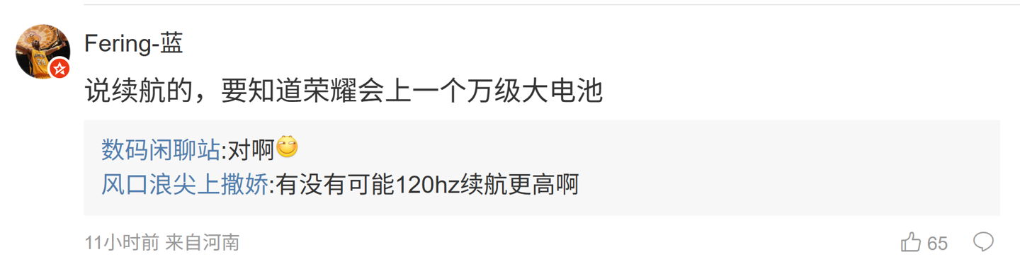 后续有用户在评论区表示:“永远落后友商一步”,博主回复道:“1.5K+185Hz 是领先吧”;另一名用户则询问道:“120 赫兹要彻底淘汰了吗”,博主则回复道:“不会,母系会坚守 120”;另外一名用户则表示:“说续航的,要知道荣耀会上一个万级大电池”,博主则表示:“对啊”。