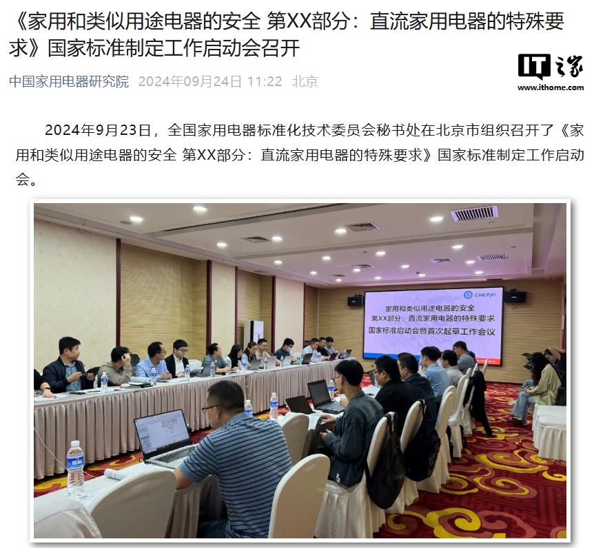 IT之家 9 月 24 日消息,据中国家用电器研究院消息,2024 年 9 月 23 日,全国家用电器标准化技术委员会秘书处在北京市组织召开了《家用和类似用途电器的安全第 XX 部分:直流家用电器的特殊要求》国家标准制定工作启动会。