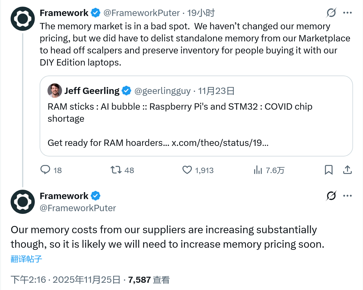 此外,模块化 PC 硬件制造商 Framework 也表示,尽管该企业尚未调整内存定价(但涨价很可能即将到来),但为了保障 DIY 版 Framework 购买者拥有充足供应、打击黄牛倒卖行为,该企业在商城下架了独立售卖的内存产品。