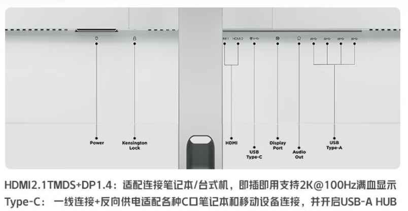 HDMI 2.1 TMDS、DP 1.4 HBR2、USB-C(75W PD 供电)、4× USB-A HUB、3.5mm 耳机孔