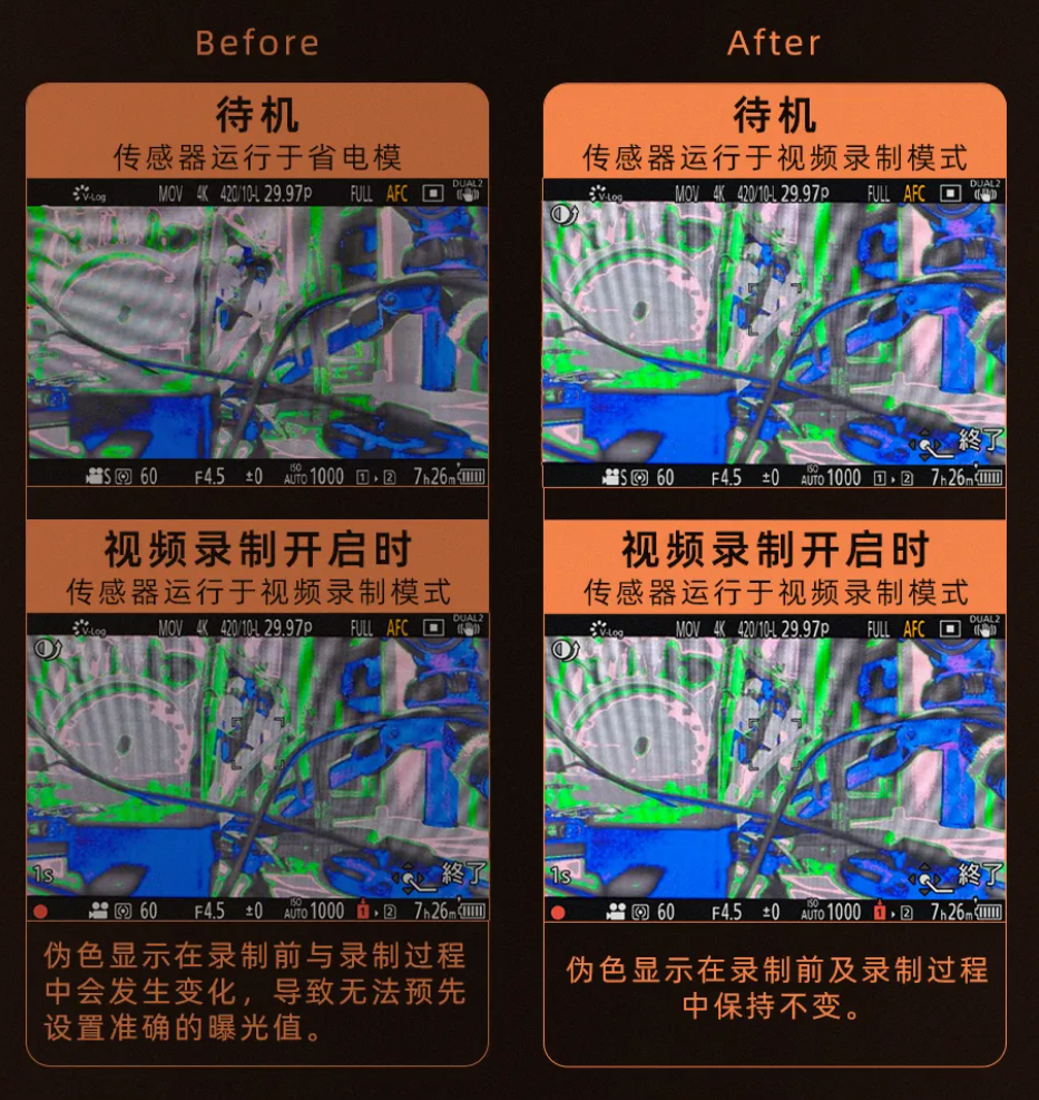 修复应用伪色功能时,待机模式与视频录制模式下实时取景画质存在差异的情况,确保曝光判断准确可靠