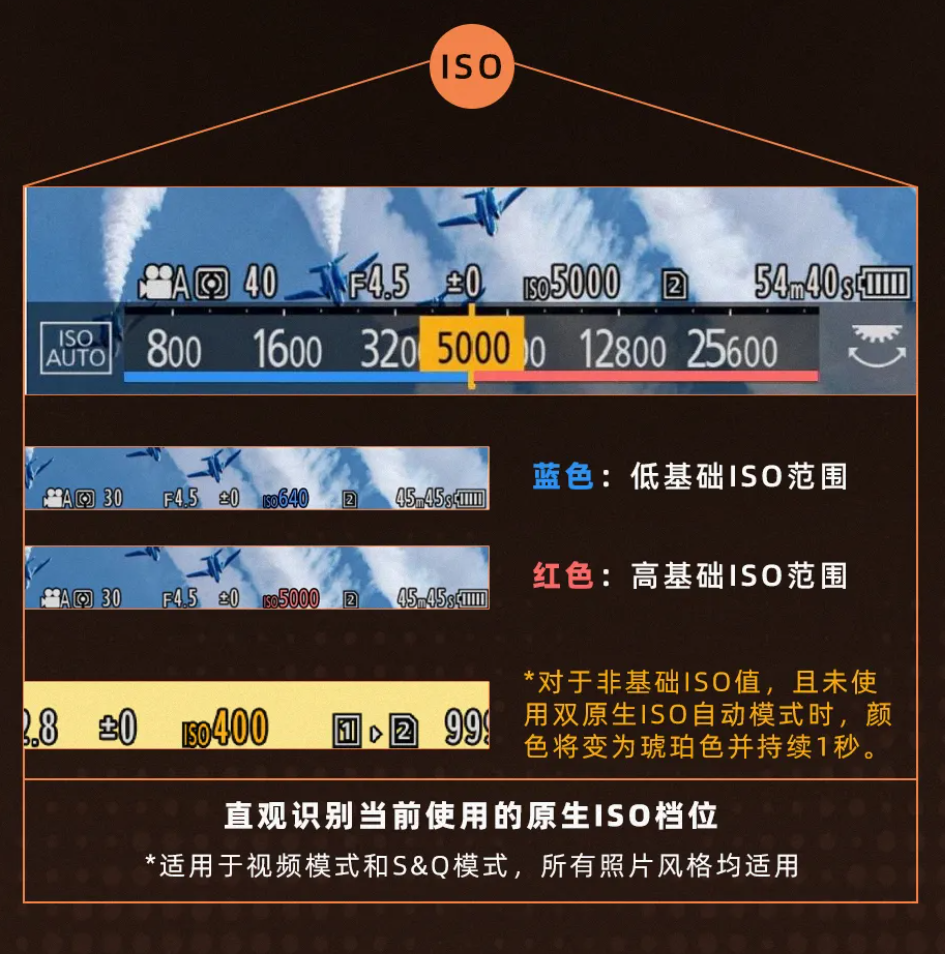 当使用 ISO 按钮更改 ISO 值时,将实时显示,用于指示 ISO 感光度处于低范围还是高范围