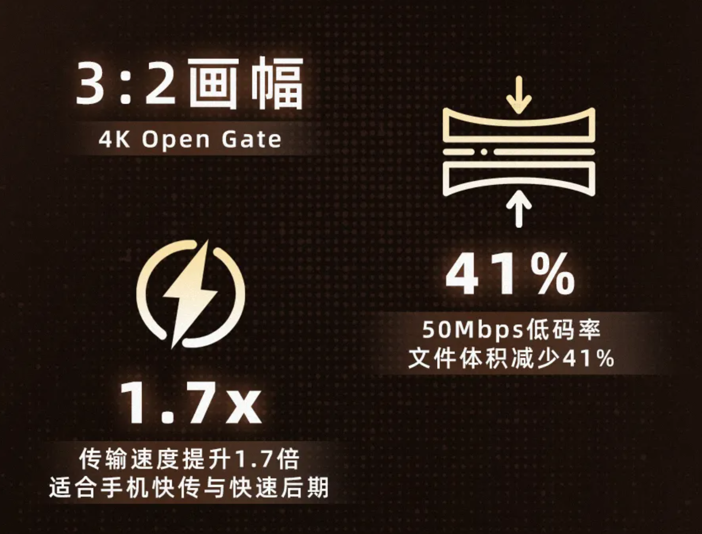 新增的 MP4(Lite)低码率格式更适合短视频等工作流,支持 3:2 画幅 4K 片门全开模式,采用 50Mbps 低码率设置,可将文件体积缩小 41%,传输速度提升 1.7 倍,适合手机快传与快速后期