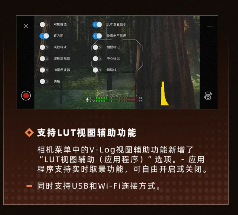 相机菜单中的 V-Log 试图辅助功能新增“LUT 试图辅助(应用程序)”选项,可自由开启或关闭