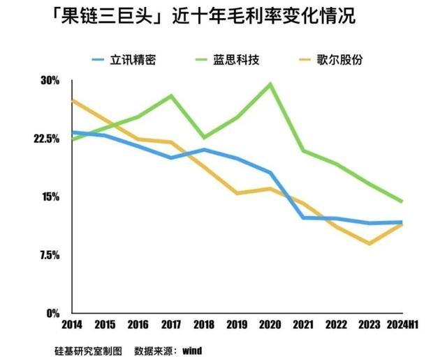 以毛利率为例,尽管今年上半年立讯精密、蓝思科技与歌尔股份毛利水平均有所优化,但横向对比过去20%上下的毛利水平,依旧处于历史低点。