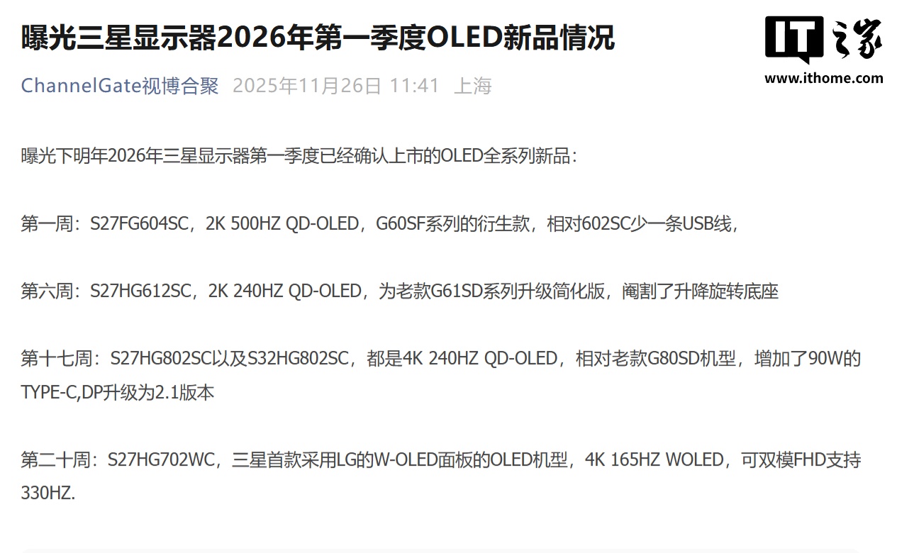 IT之家 11 月 27 日消息,公众号“ChannelGate 视博合聚”昨日(11 月 26 日)发布博文,曝光了三星显示器 2026 年第 1 季度 OLED 新品情况,其中最值得关注的是,将首次采用其主要竞争对手 LG Display 的 WOLED 面板。