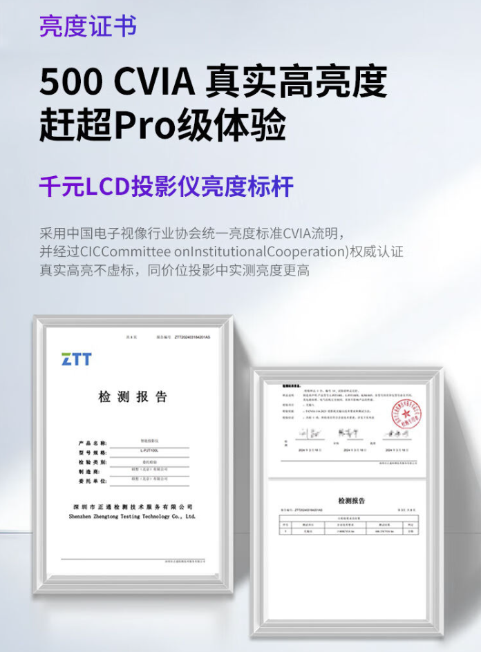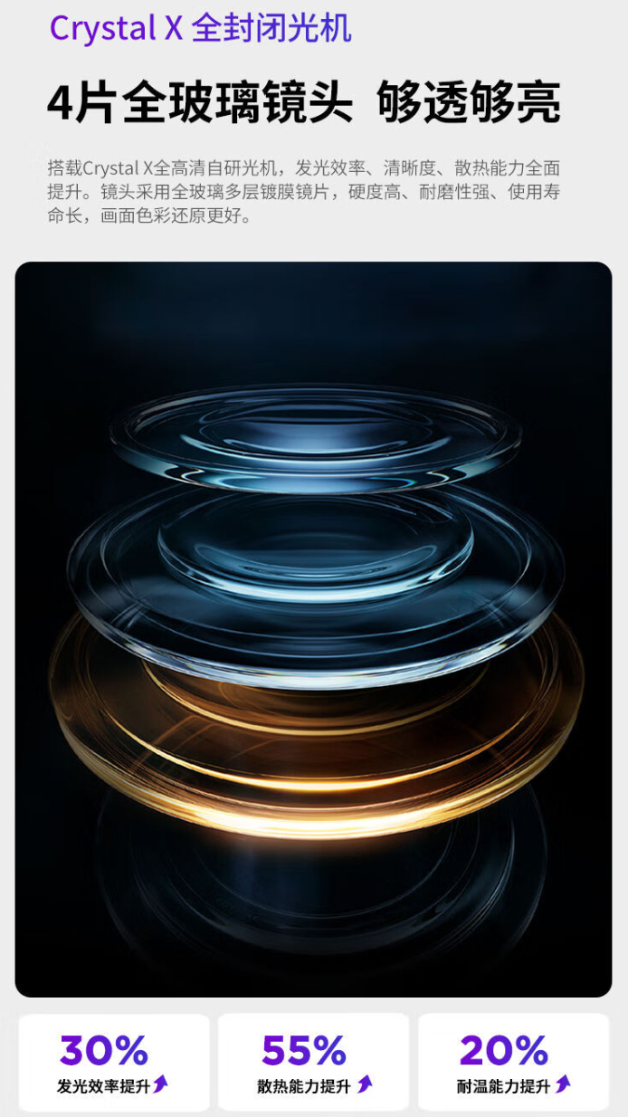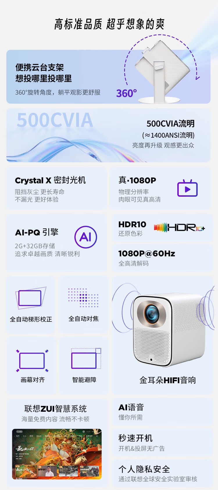 据介绍,联想小新 100GT 投影仪采用 Crystal X 全密封光机,拥有 1080P 物理分辨率,支持 500CVIA 流明亮度(≈1400ANSI 流明)。