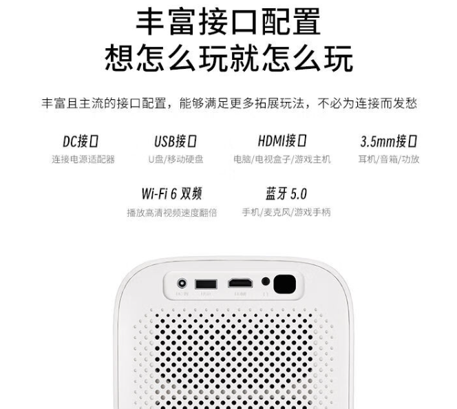 该款投影仪还配备 360° 便携云台支架,标配 2GB+32GB 内存组合,支持 1080P@60Hz 内容解码。投影仪接入 Wi-Fi 6 网络协议,对比度 2500:1,支持 HDR10。