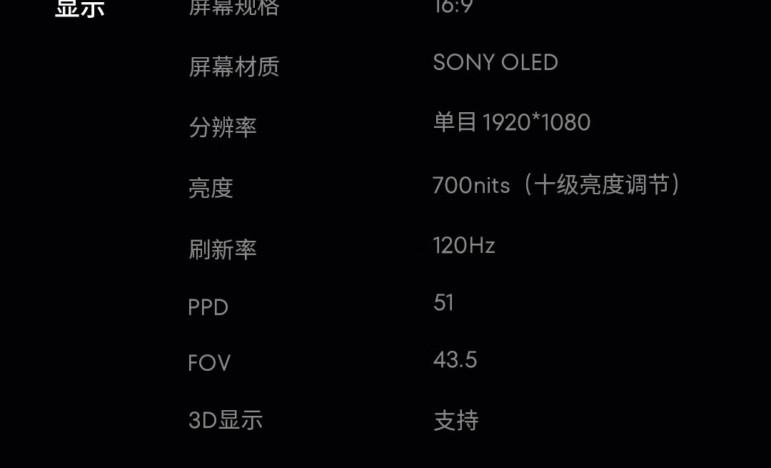 星纪魅族 AR 智能眼镜 StarV View 采用了视网膜级显像(PPD 51),拥有 700nits 峰值亮度、120Hz 刷新率,支持 50:1 虚实显示对比度,10 万:1 的图像对比度,可投 188 英寸画面。
