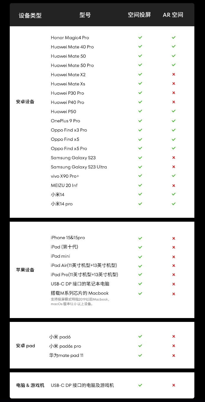 IT之家附星纪魅族 AR 智能眼镜 StarV View 眼镜参数及兼容性列表如下: