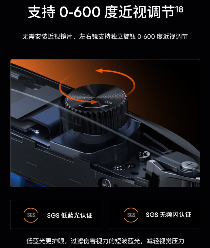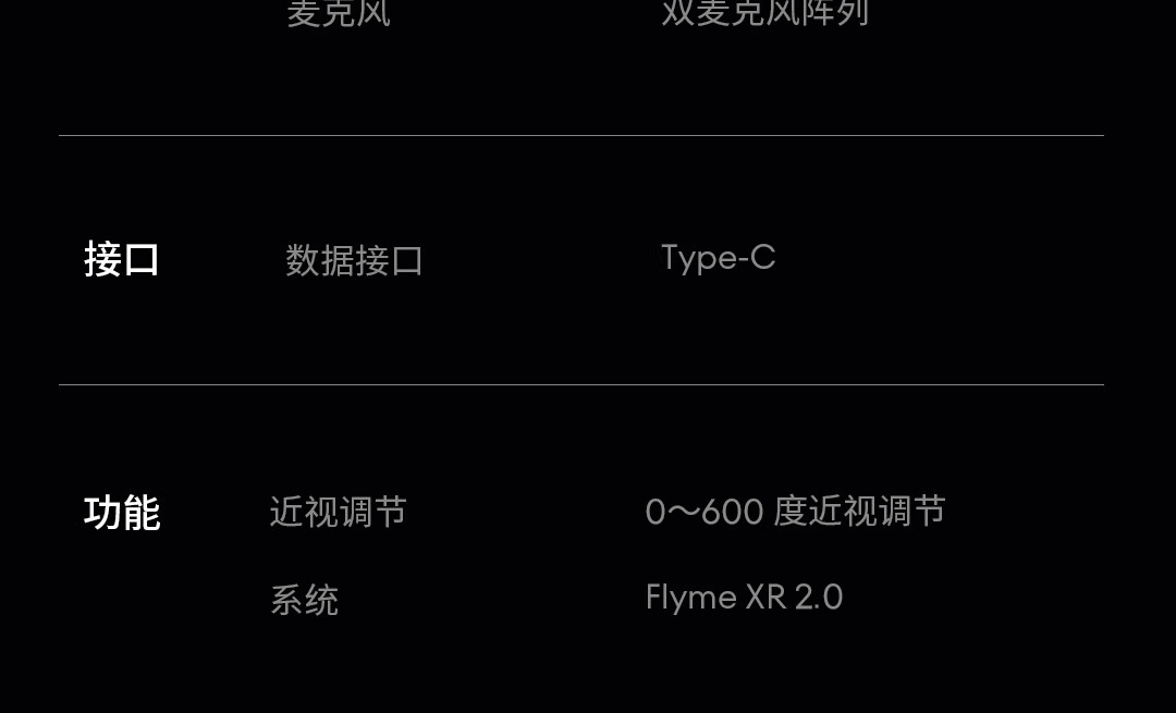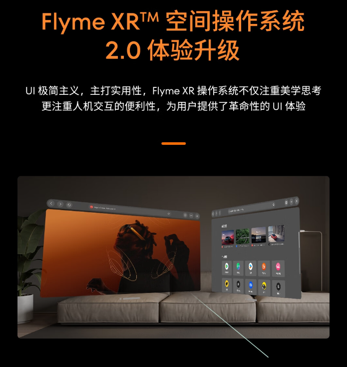该眼镜可提供 85mm / lp 清晰度,支持 10 档亮度调节,支持三档色彩模式,覆盖 108% sRGB 色域,预装 Flyme XR 2.0 空间操作系统,支持 0-600 度近视调节。