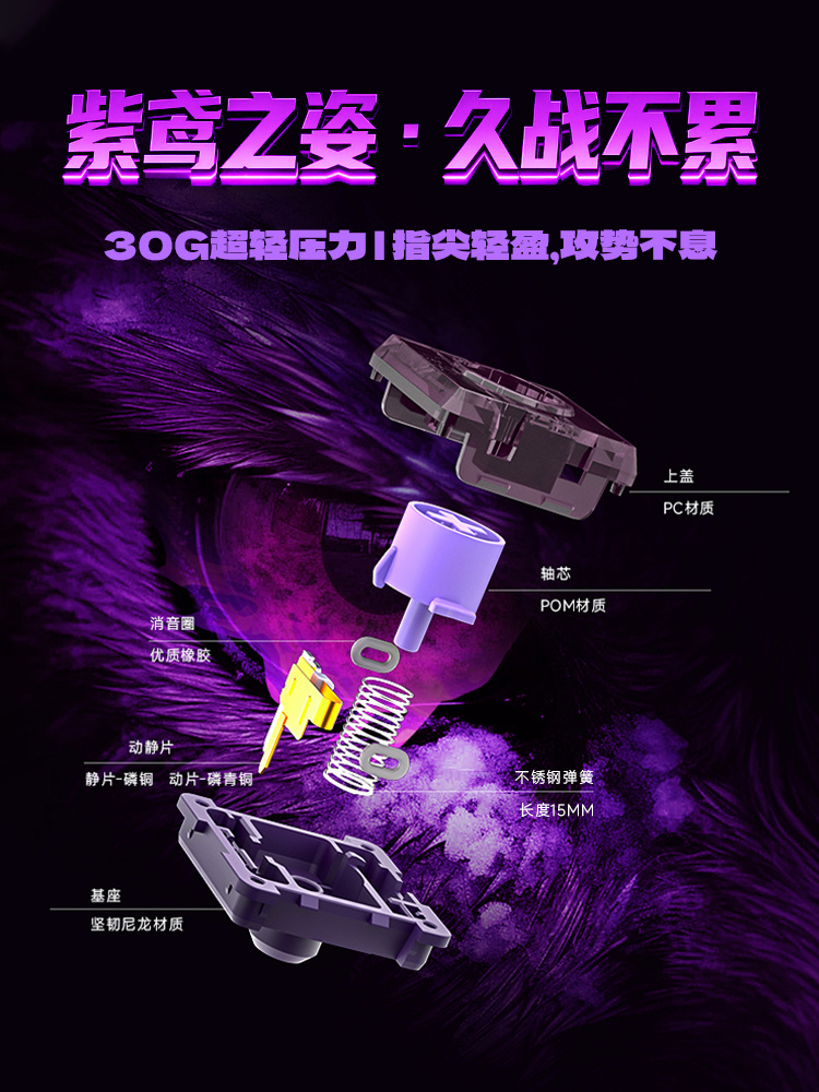 在具体参数方面,紫鸢轴机械寿命 5000 万次,触发力度 30±10gf,回弹力 10gf min,击键声音 25dB。