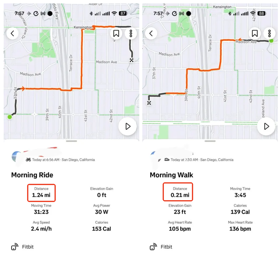 为了验证这一问题,almosttan 对比了相似路线下的不同运动记录。测试结果显示,当记录为“骑行”时,手表数据与 Google 地图的测量结果基本一致;但在记录“步行”时,手表显示的距离竟然还不到实际距离的四分之一。这种巨大的数据断层,显然无法单纯用 GPS 信号漂移来解释。