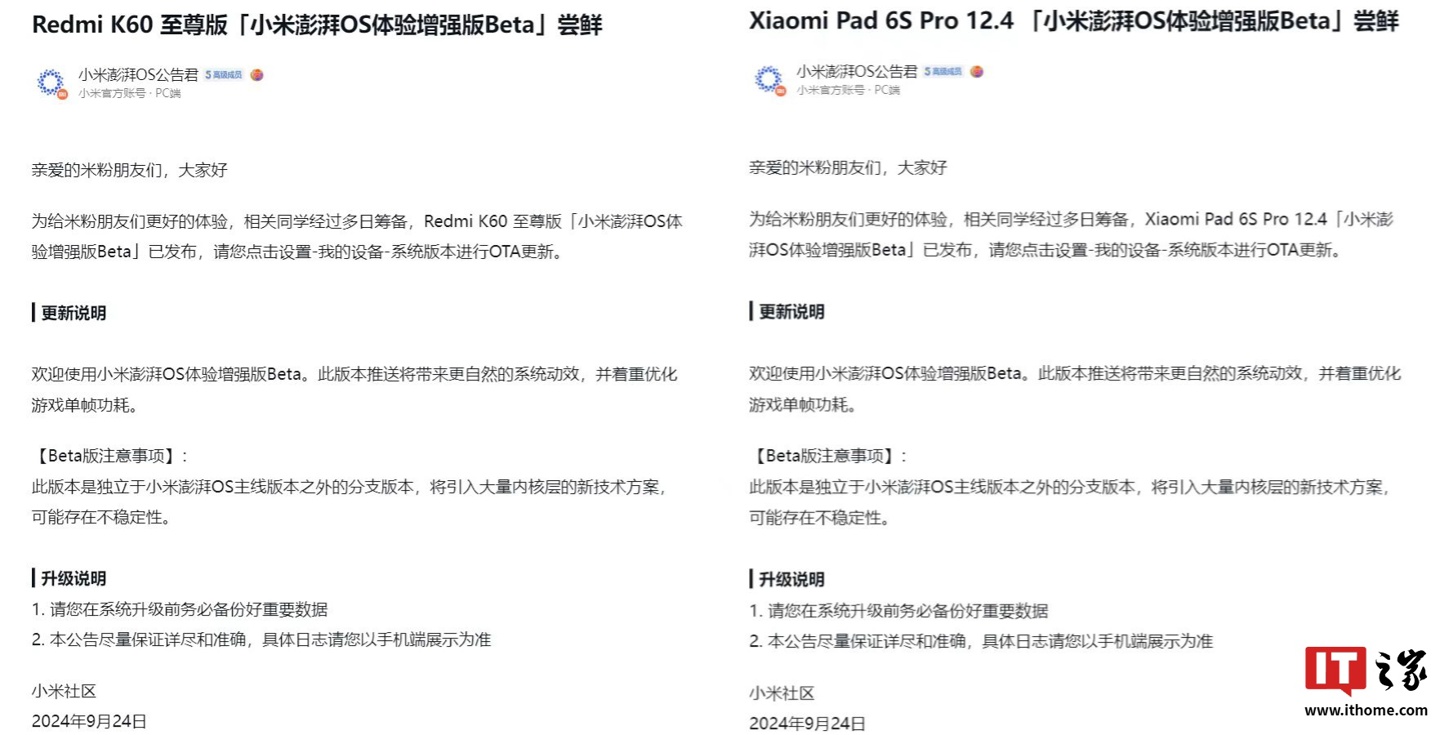 IT之家 9 月 24 日消息,小米官方今日发文宣布,小米平板 6S Pro 12.4 和 Redmi K60 至尊版手机获推澎湃 HyperOS 体验增强版 Beta 尝鲜升级,版本号 1.1.3.0.VNXCNXM.BETA / 1.1.3.0.VMLCNXM.BETA,系统包大小约 6.2 GB。