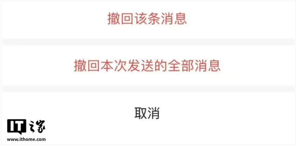 升级后,“撤回”一分为二,划分为“撤回该条消息”和“撤回本次发送的全部消息”。