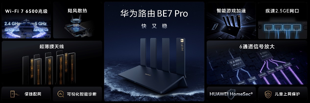最新华为路由 BE7系列支持6500兆级速率,搭载华为超薄膜天线,对天线技术和设计进行创新,且厚度仅为0.188mm,是华为首款搭载飓风散热的Wi-Fi 7路由器。