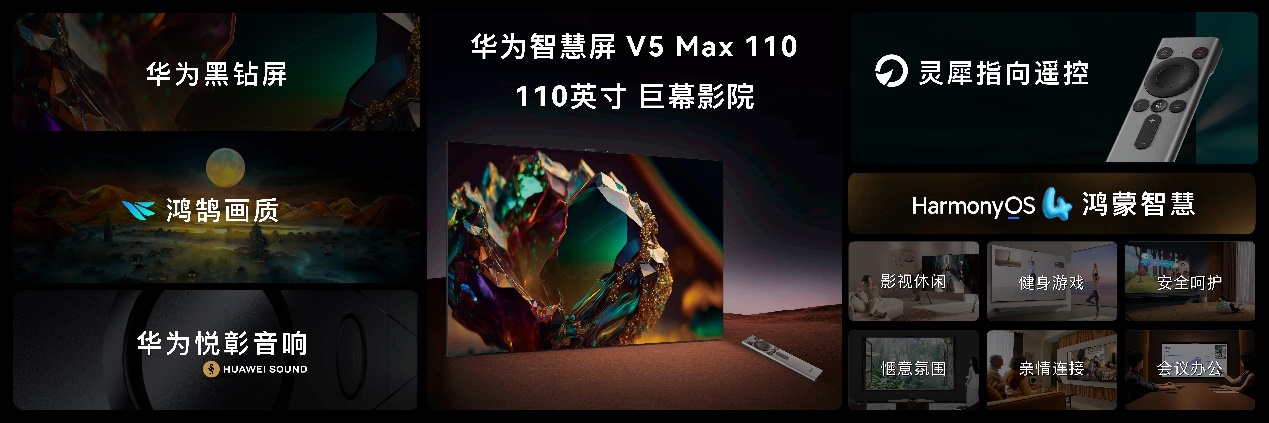 华为智慧屏 V5 Max 110正式亮相。新品采用110英寸超大屏幕,屏占比达到99%,边框仅有1.2mm,屏幕面积比98英寸足足大了 26.4%,配备Super MiniLED屏幕——华为黑钻屏,该屏幕采用黑钻聚能SuperMiniLED、多晶量子点膜、黑钻超维场液晶技术、黑钻全景臻彩液晶补偿、纳米复合低反膜等技术手段,使得显示屏拥有了高亮度、高色域、高对比、广视角、超低反射五大核心优势。此外华为智慧屏 V5 Max 110精确控光分区,峰值亮度达到5000nits,在强光环境中屏幕上的内容依然清晰可见。DCI-P3 125%、BT2020 91%的超广色域,加上日本前索尼专家调优、自动PQ调试调色,带来电影级的显色能力。
