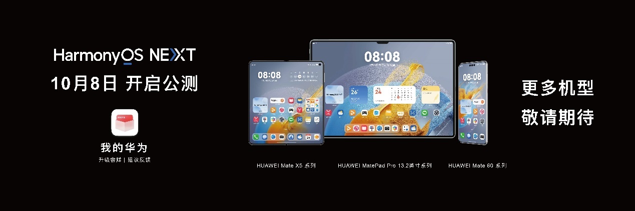 余承东宣布,HarmonyOS NEXT将于10月8日正式开启公测,首批公测机型包括华为Mate 60系列、华为Mate X5系列和华为MatePad Pro 13.2系列。消费者可以通过“我的华为”APP-“升级尝鲜”申请升级。