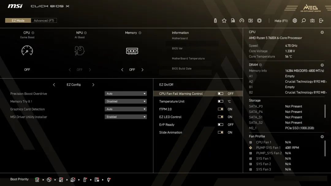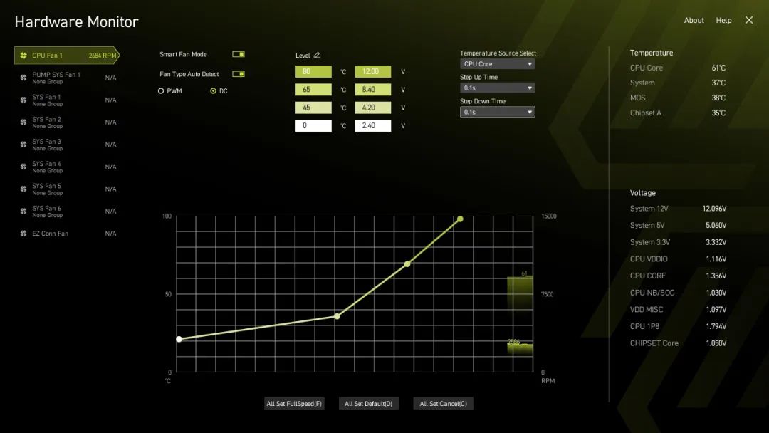CLCIK BIOS X 拥有新的硬件监控器,所有连接到主板的风扇都会显示在硬件监控器中。它还能显示 CPU、内存和 GPU 等关键部件的电压、频率和温度。