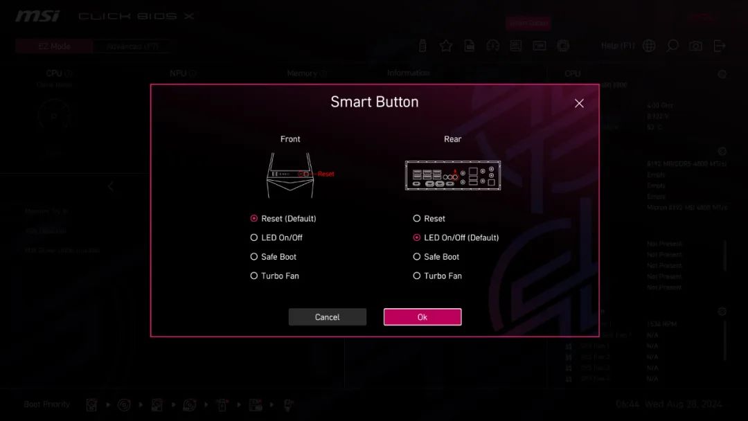 CLCIK BIOS X 配备 SMART 智能按键,只需一个按键就能实现多种控制。用户可以在 BIOS 中设置不同的功能。只需点击一下,就能重置电脑、安全启动、涡轮风扇和 EZ LED 控制。