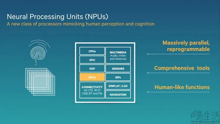 举例来说,早期的“手机AI”几乎都集中在“计算视觉”领域,比如用摄像头来进行面部识别、拍照时的自动场景优化,甚至包括播放视频时自动画面增强等。这些技术就需要NPU有很强的图像信号吞吐量,所以最早的NPU几乎完全将重心放在了纯粹的“峰值算力”上,要的就是在最短的时间里“算完”。由于其余的时候NPU很少会参与手机的日常工作,所以能效比差点也无所谓。