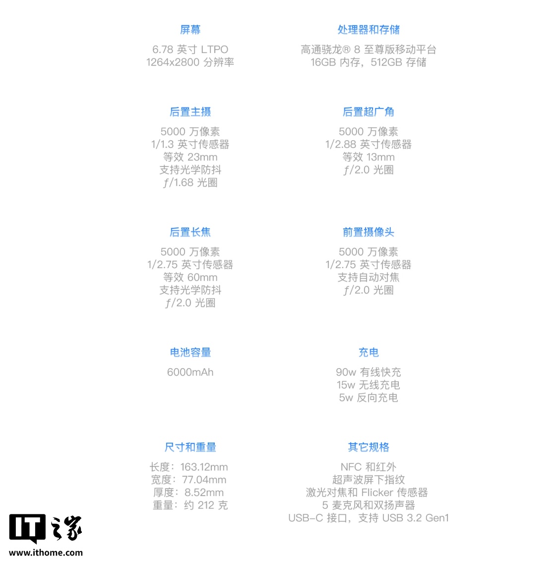 根据参数图可以看到,这台手机配备 16GB 内存和 512GB 存储空间,搭载一块 6.78 英寸 LTPO 显示屏,分辨率是 1264*2800,后置主摄采用一块 1/1.3 英寸 5000 万像素传感器,等效 23mm,支持光学防抖,超广角则是 5000 万像素 1/2.88 英寸,等效 13mm,长焦为 50MP 1/2.75 英寸,支持光学防抖。