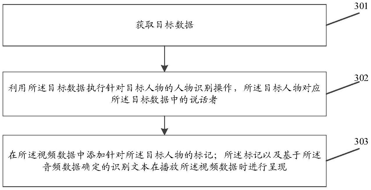 一种数据处理方法、装置、服务器和存储介质。其中,所述方法包括:获取目标数据(301);所述目标数据包括视频数据和音频数据;利用所述目标数据执行针对目标人物的人物识别操作,所述目标人物对应所述目标数据中的说话者(302);在所述视频数据中添加针对所述目标人物的标记;所述标记以及基于所述音频数据确定的识别文本在播放所述视频数据时进行呈现(303)。