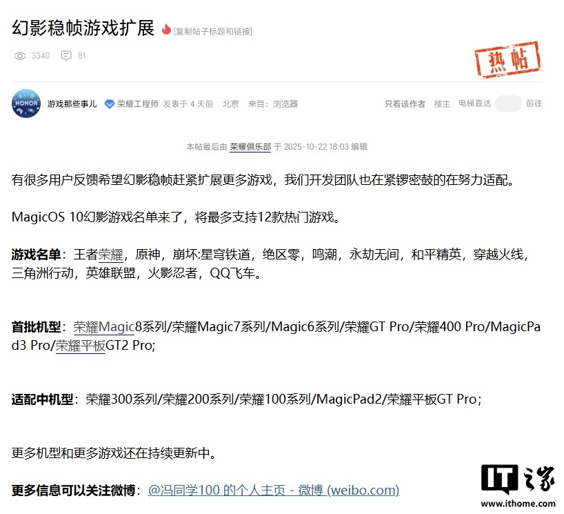 IT之家注意到,荣耀 Magic5 系列等机型已实装幻影稳帧功能,支持在游玩《王者荣耀》《原神》等 12 款游戏时使用(游戏完整名单:《王者荣耀》《原神》《崩坏:星穹铁道》《绝区零》《鸣潮》《永劫无间》《和平精英》《穿越火线》《三角洲行动》《英雄联盟》《火影忍者》《QQ 飞车》)。