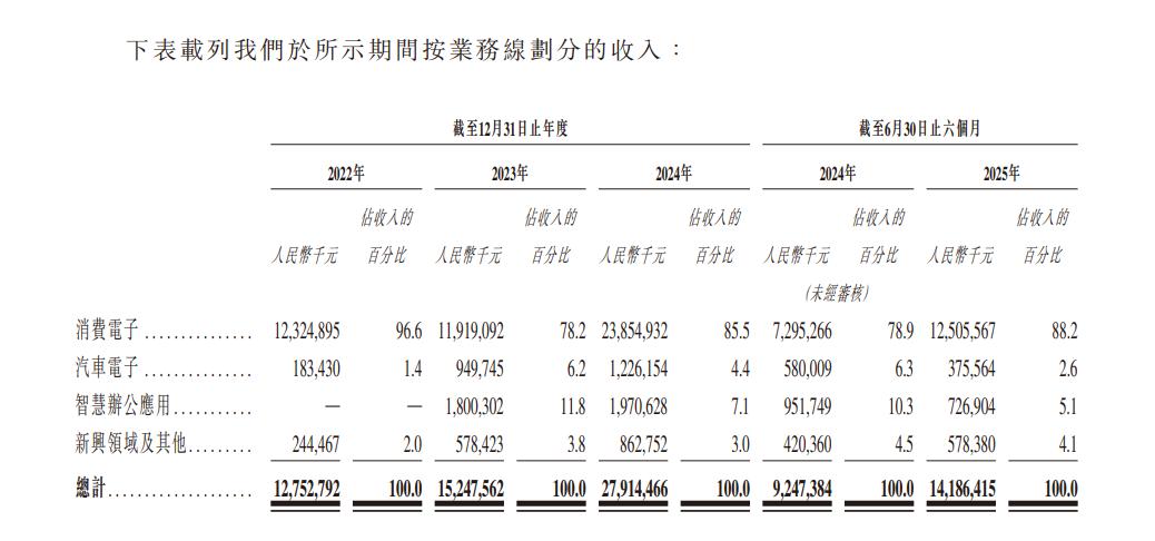 招股书显示,立景创新的收入主要来自销售消费电子产品,包括应用于智能手机、笔记本计算机及平板计算机的摄像头模块。2022年、2023年、2024年及2025年上半年,立景创新来自核心的消费电子业务的营收分别为123.25亿元、119.19亿元、238.55亿元及125.06亿元,分别占各期间总收入的96.6%、78.2%、85.5%及88.2%。