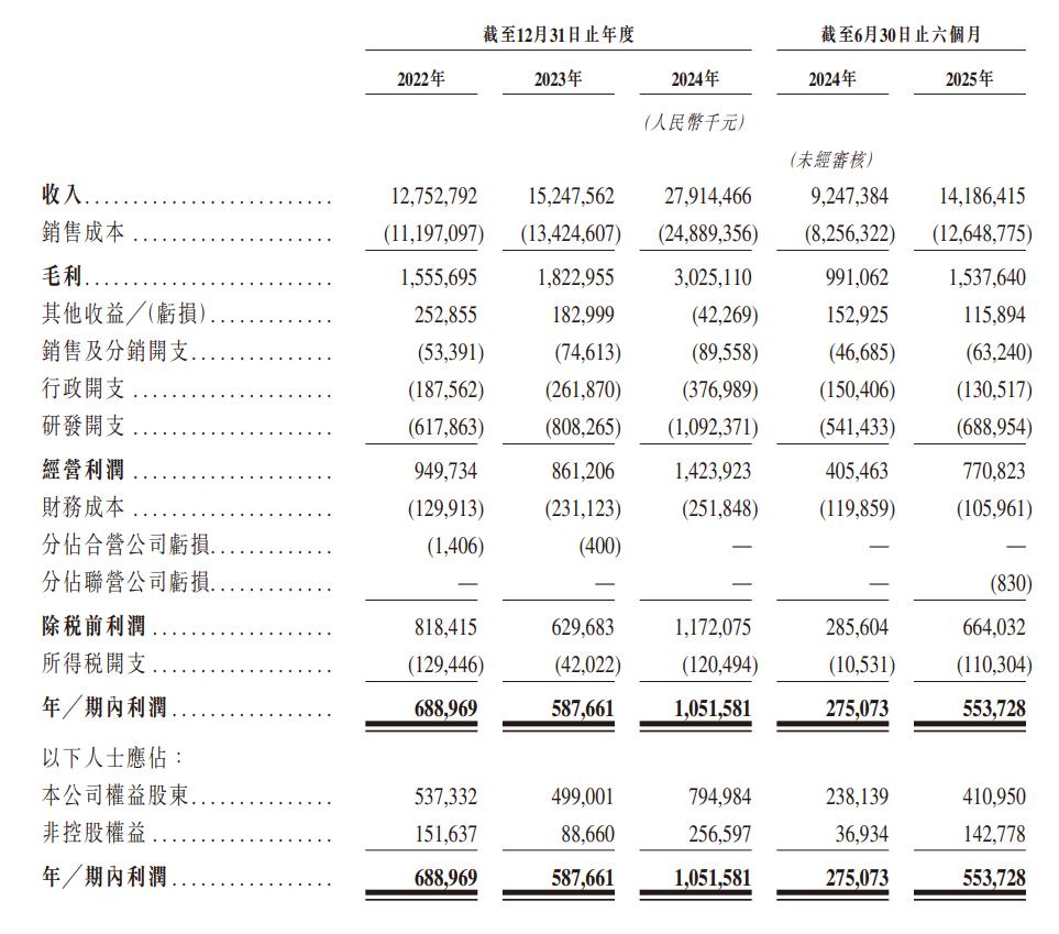 上述操作让立景创新的业务体量不断增大。招股书显示,2022年、2023年、2024年及2025年上半年,立景创新收入分别为127.53亿元、152.48亿元、279.14亿元及141.86亿元;毛利分别为15.56亿元、18.23亿元、30.25亿元及15.38亿元;年内利润分别为6.89亿元、5.88亿元、10.52亿元及5.54亿元。
