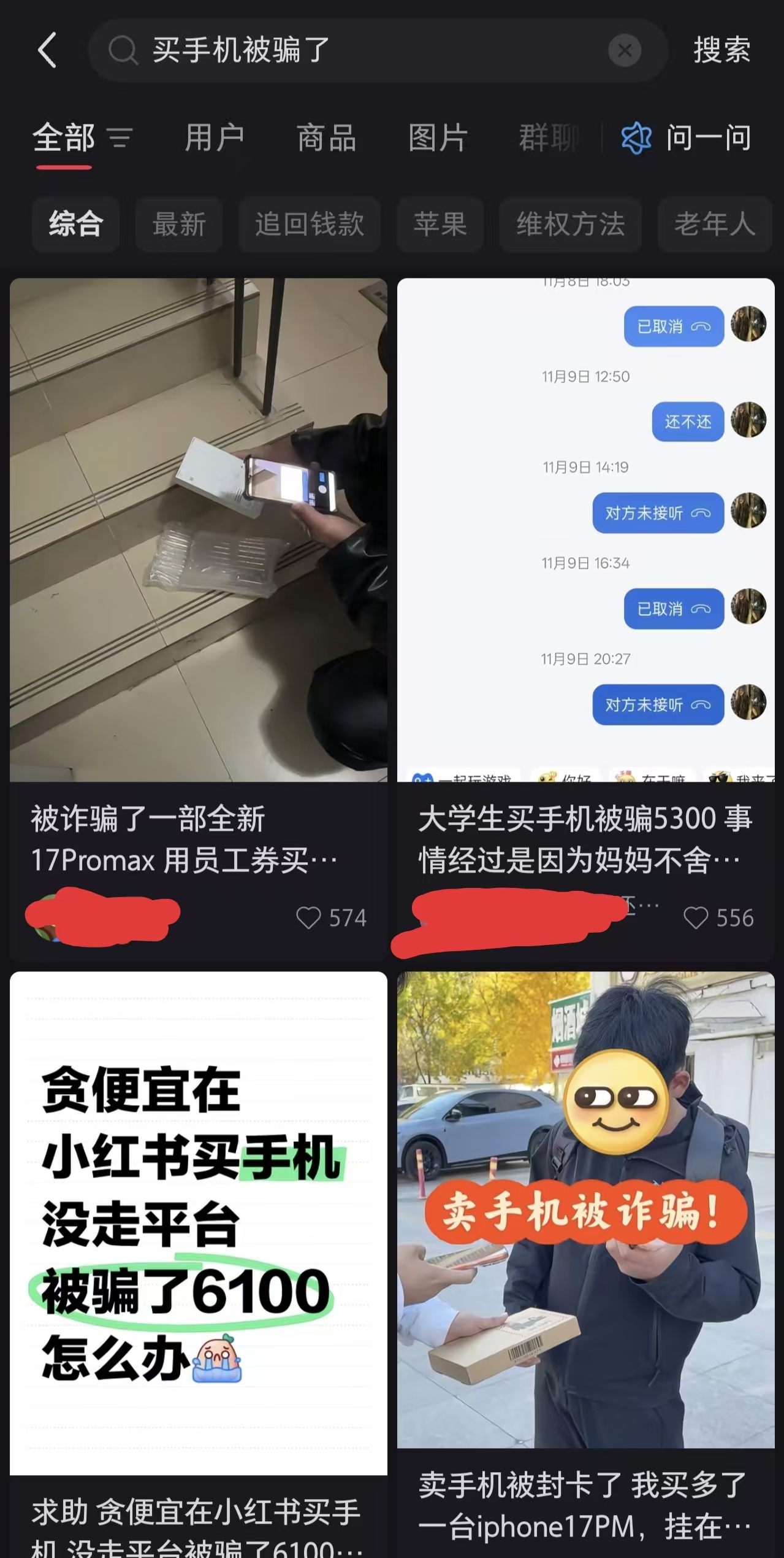 数码科技产品,由于较高的客单价,也就成了「最佳」的网络诈骗商品类别了。在小红书搜索诸如「买手机被骗了」之类的关键词,有大量鲜活案例,每天都在上演。