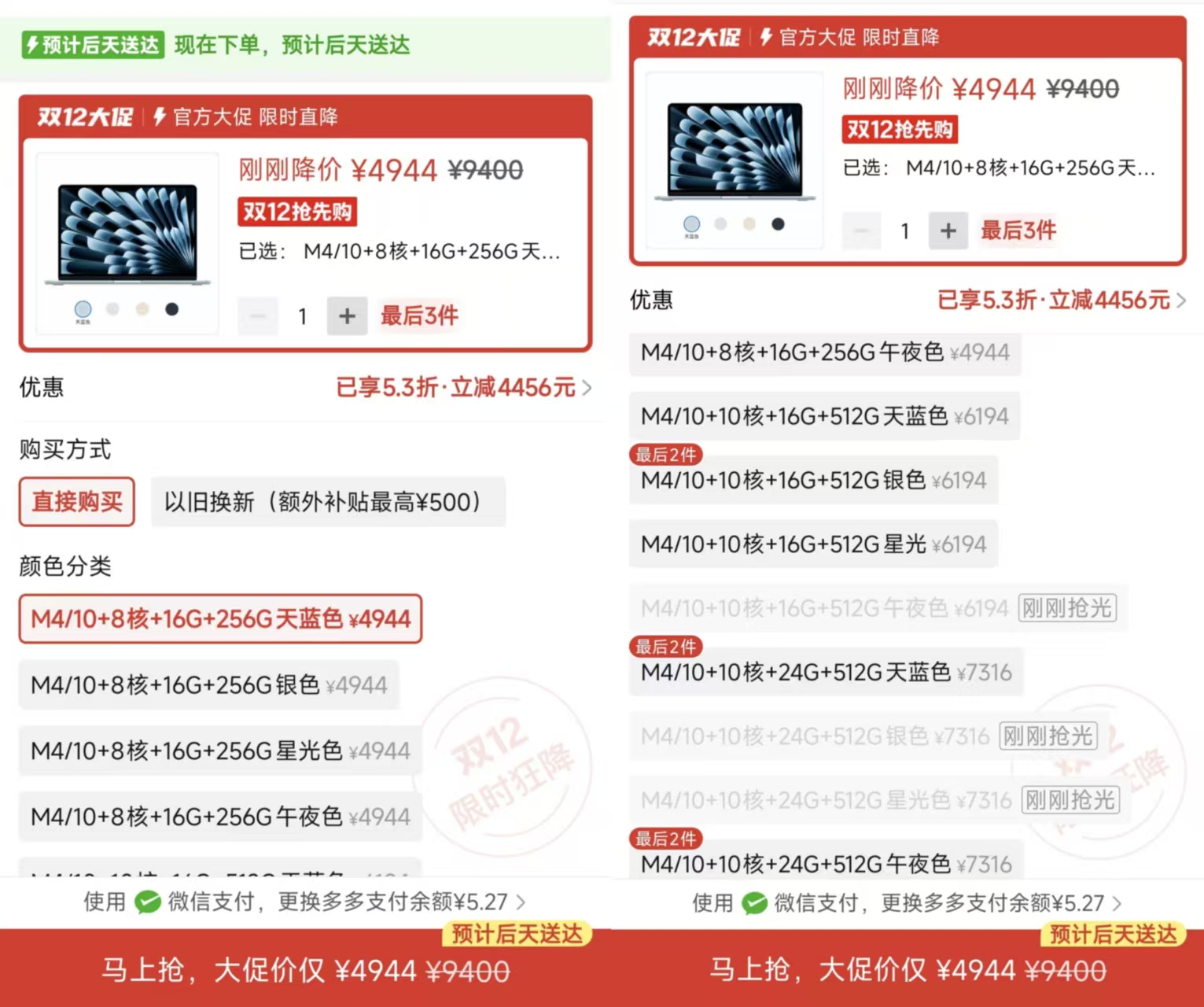 点进去之后,实际下单页面,M4 MacBook Air 入门款(16+256GB)价格的确如上所示,只要 4900 多元,16+512GB 版本只要 6100 多元,24+512GB 版本只要 7300 多元,均比百亿补贴价格还要再低几百块。