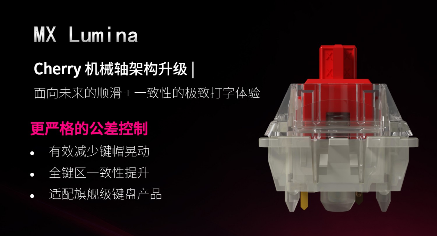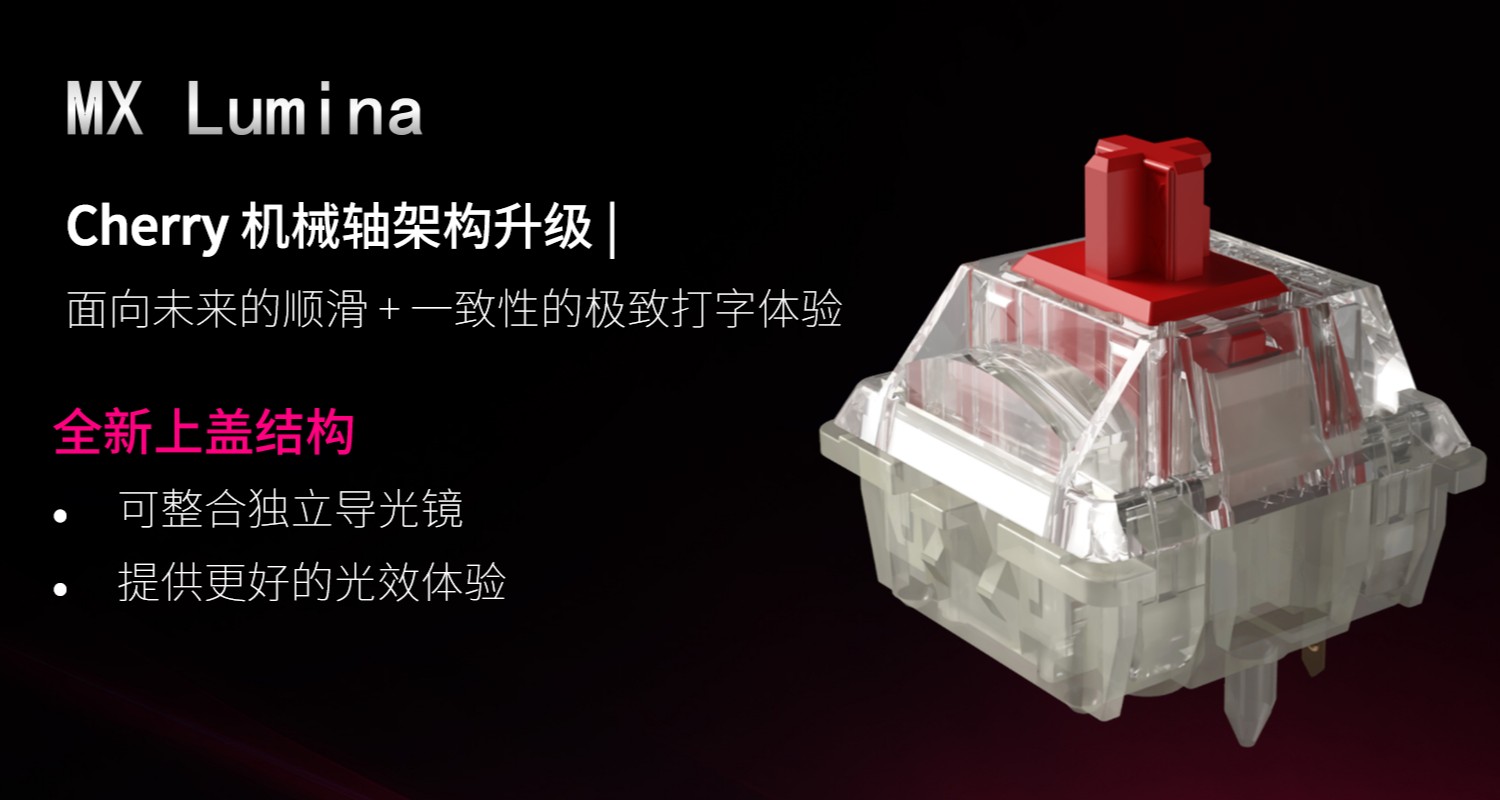 CHERRY 表示 MX Lumina 是其 MX 系列机械轴体家族的架构升级迭代,可提供面向未来的顺滑打字体验。