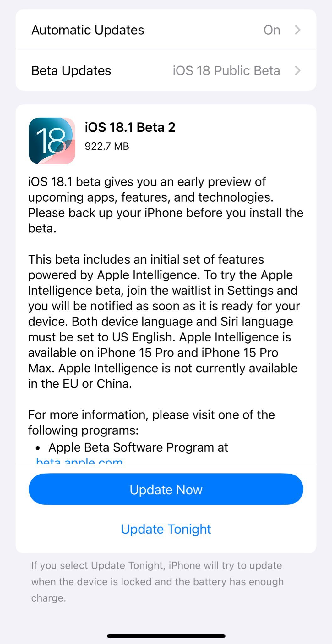 已注册苹果测试计划的公开测试版用户可以打开设置应用,点击软件更新部分,选择公开测试版选项,下载 iOS 18.1、iPadOS 18.1 和 macOS Sequoia 15.1 更新。