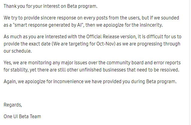 三星版主在社区回复网友提问,表示团队正仔细监测用户反馈和错误报告,将进一步打磨系统,修复一些错误,稳定版预计将于 10 月或 11 月推出。
