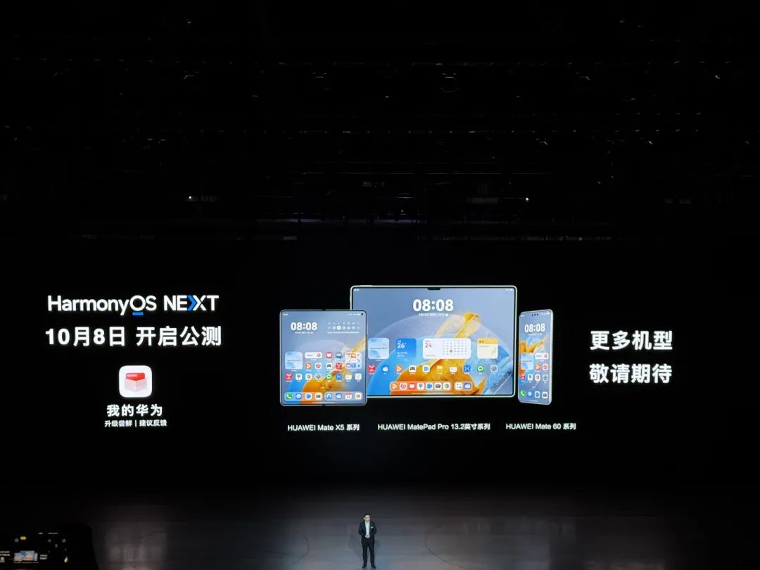 终于,在本场发布会中,余承东宣布 HarmonyOS NEXT 将于 10 月 8 日正式开启公测,首批公测机型包括华为Mate 60 系列、Mate X5 系列和 MatePad Pro 13.2 系列。用户可通过“我的华为”APP-“升级尝鲜”申请升级