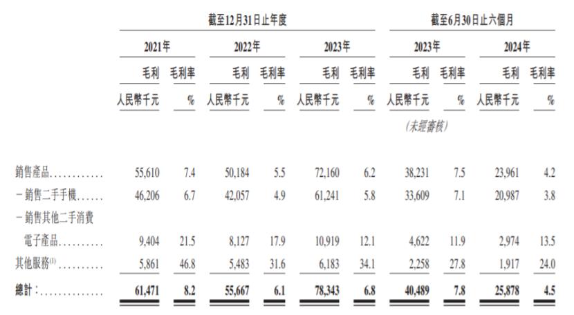 招股书显示,2021年至2024年上半年,闪回科技销售二手手机的毛利率从6.7%下滑至3.8%,整体毛利率从8.2%降至4.5%。